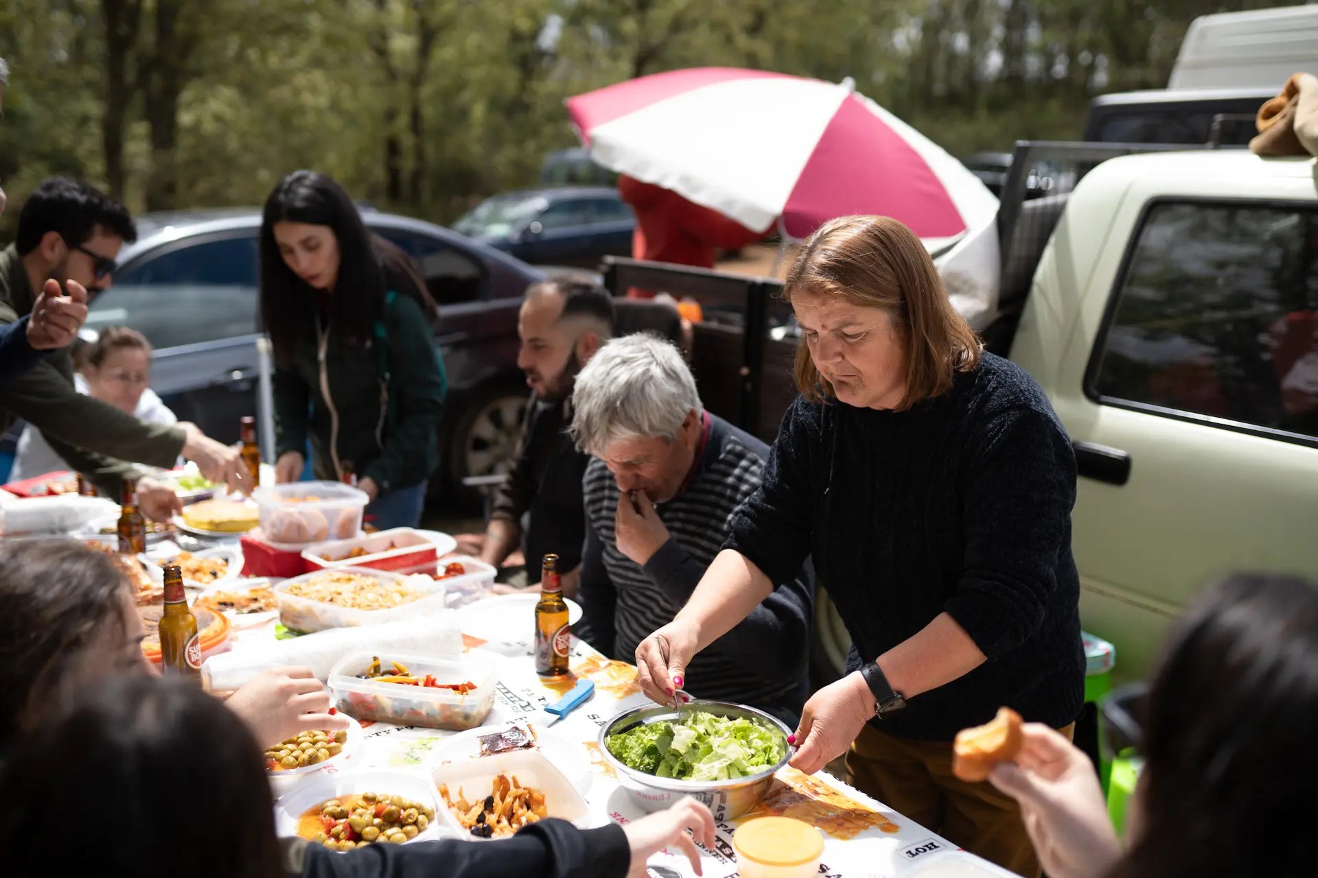 Lo cierto es que, con el asunto de la comida, los puestos portugueses sacan cierta ventaja. Al menos, por infraestructura y aspecto. En una de las zonas ubicadas al margen de la carretera, una mujer completamente enlutada, de esas de toda la vida, va poniendo el ojo primero en el pulpo, luego en la carne y más tarde en las alubias. A la vista de tal exhibición, muchos de los que buscan mesa se van situando en la pequeña carpa que hay tras las brasas en las que se maneja la señora.