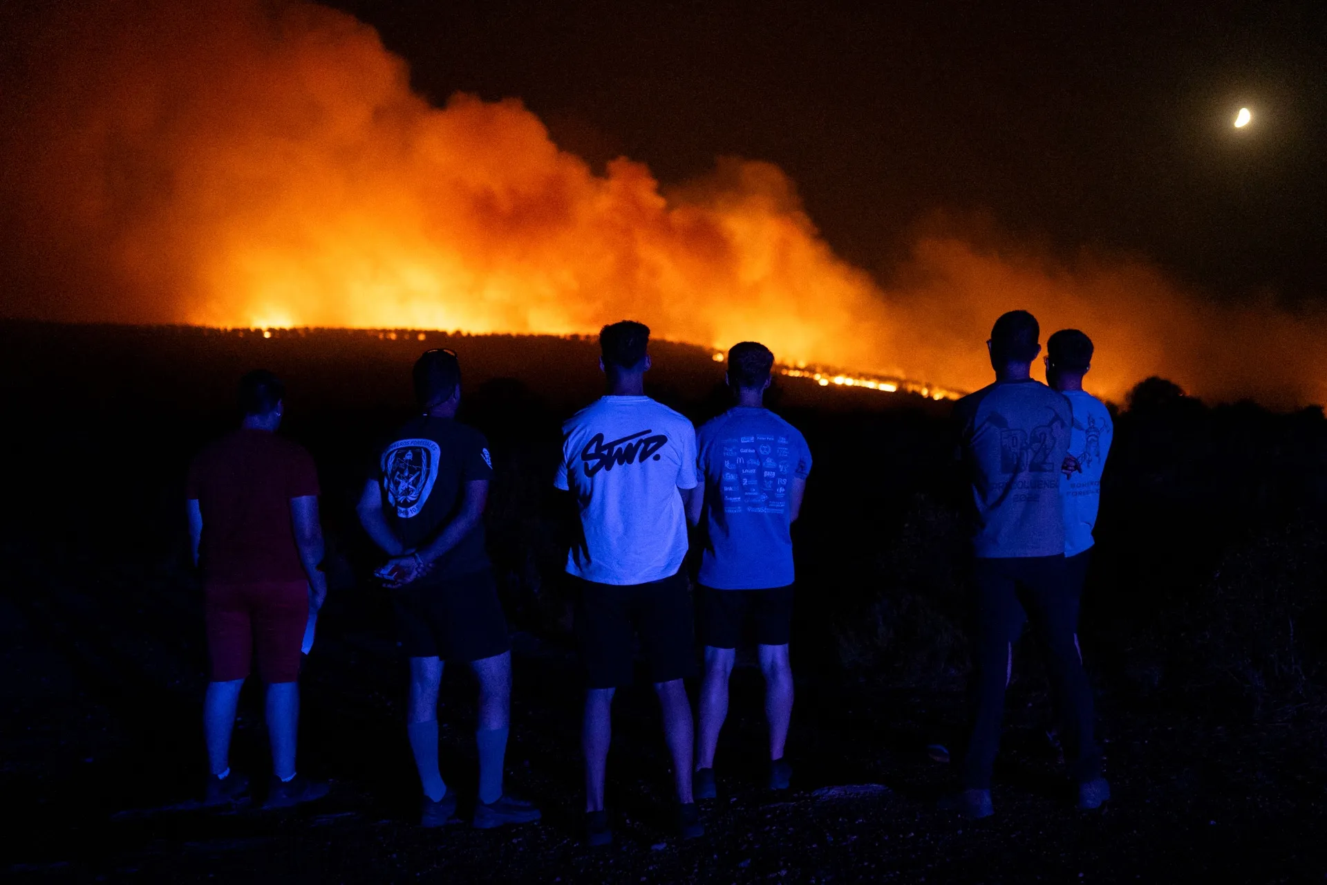 Varios jóvenes observan el fuego en Vivinera, cerca de la frontera con Zamora. Foto Emilio Fraile