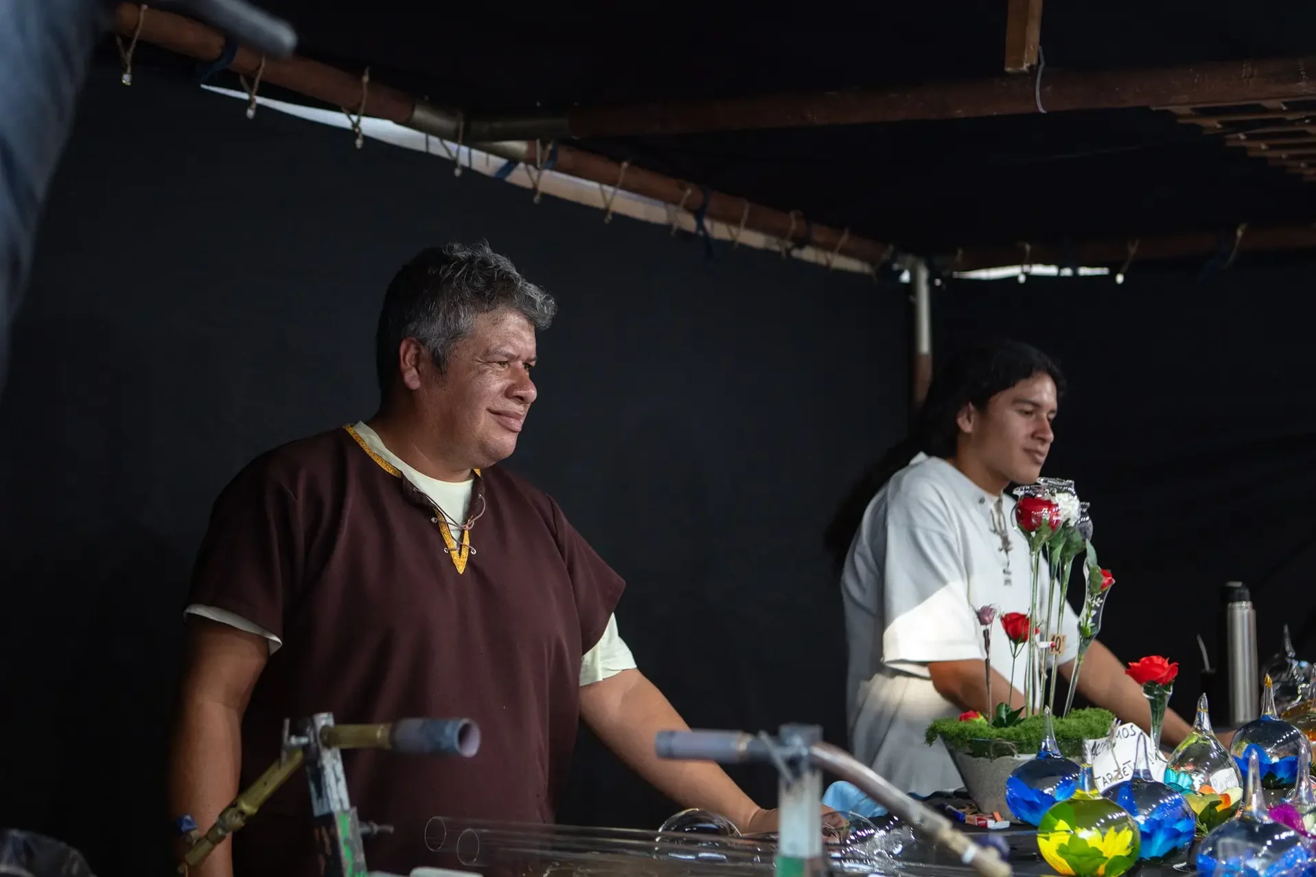 Dos de los artesanos del mercado medieval, padre e hijo, llegaron hace cinco años de Argentina, la tierra a la que emigró su antepasado, para exhibir la técnica del cristal soplado de feria en feria