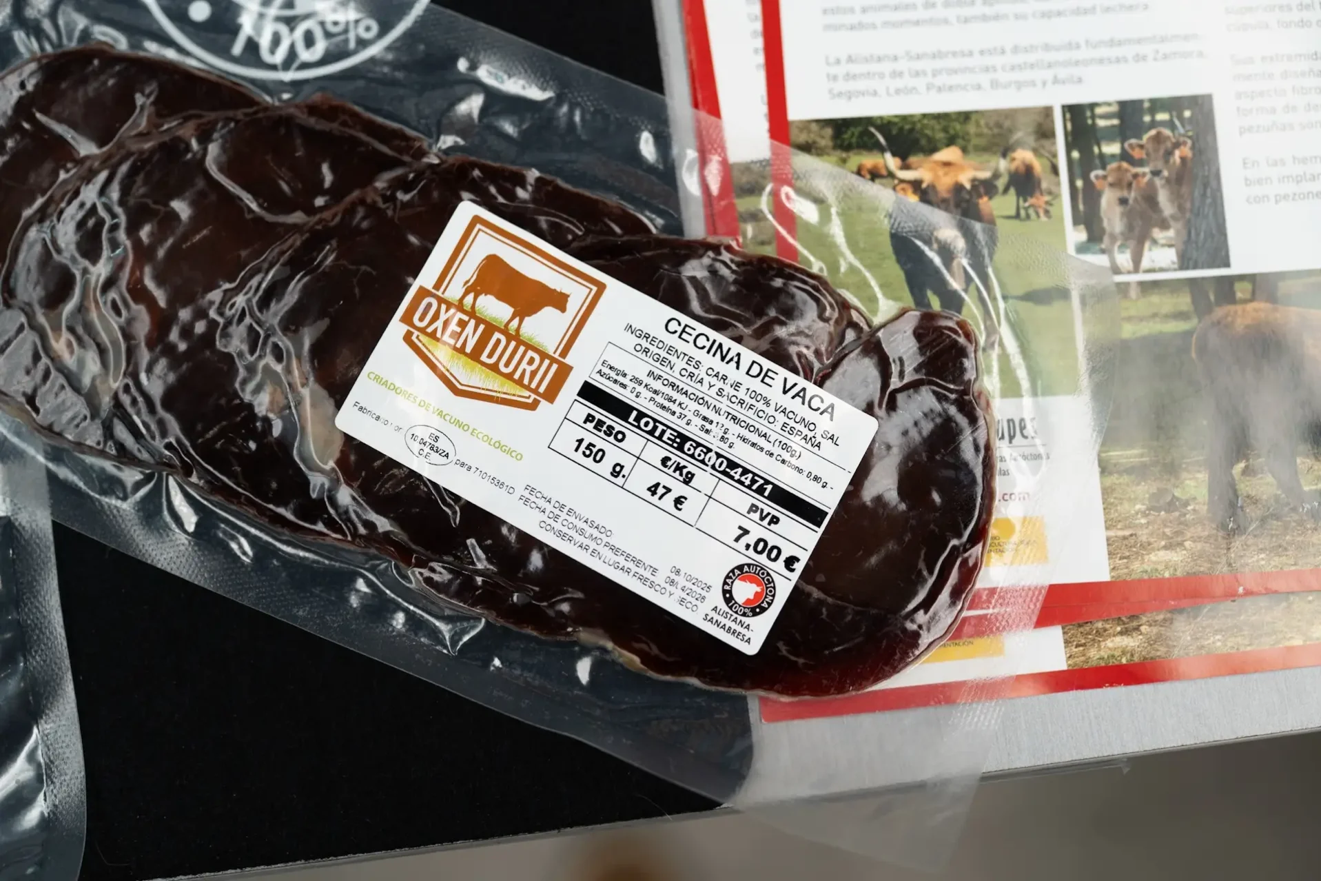 «Nosotros también le metemos como un 20% de cerdo para darle un poquito más de suavidad y que sea algo duradero. Si lo hiciésemos solo con vacuno, se seca antes, es más magro y tiene un sabor más intenso, teniendo en cuenta que la raza alistana ya tiene un sabor intenso de por sí», recalca el responsable de Oxen Durii, que se lanzó a la aventura empresarial de la mano de este tipo de ganado: «Mira, esta cecina es de un toro de once años», añade Alejandro López, que admite que algunas de sus propuestas están «todavía en el proceso de I+D». Es decir, en fase de optimización.