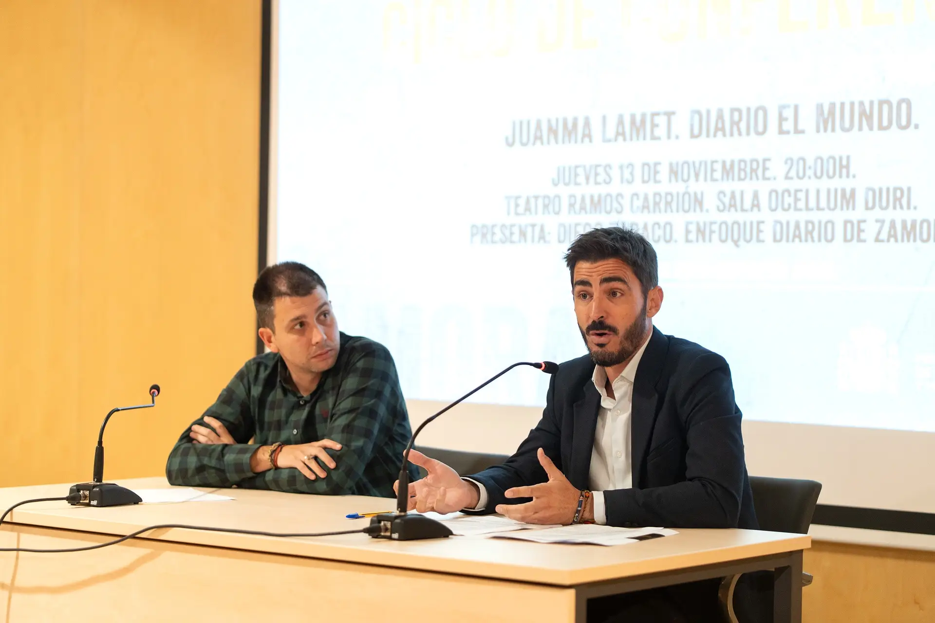 Juanma Lamet (Sevilla, 1983) vino a Zamora a hablar de la España que se construyó tras la muerte del dictador Francisco Franco y terminó por analizar temas del presente en su propia alocución y en las respuestas a las preguntas del público que se congregó para escuchar sus palabras en las dependencias del Teatro Ramos Carrión. El periodista de El Mundo fue el protagonista de la segunda de las conferencias del ciclo «50 años de España en Libertad», una charla presentada por uno de los profesionales de esta casa, Diego G. Tabaco.