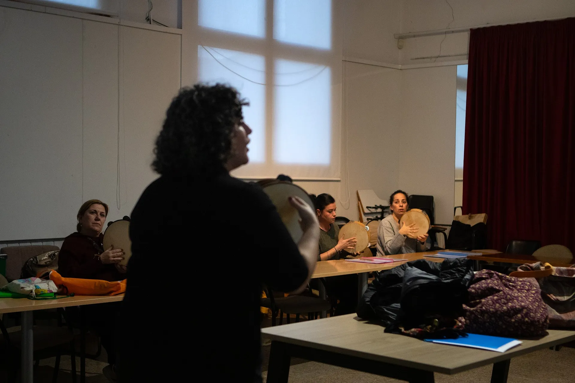 María Prieto es una de las profesoras y asegura que son alrededor de 150 las personas que cada miércoles por la tarde acuden a la Escuela para aprender sobre folklore, para tocar algún instrumento, para cantar, bailar, para coser prendas tradicionales pero, sobre todo, para socializar y para pasar el rato en compañía de personas con las mismas aficiones. Muchos, la mayoría, son de Benavente, pero también llegan personas de los pueblos de la contorna, que se refugian en la iniciativa cultural que propicia la Escuela ante la escasez de actividades lúdicas en sus pueblos. “Lo que imaginas. Vienes, charlas con la gente, tocas la pandereta, tomas un café, haces la compra y te vas al pueblo de otra manera”, resume una de las alumnas justo antes de empezar su clase.