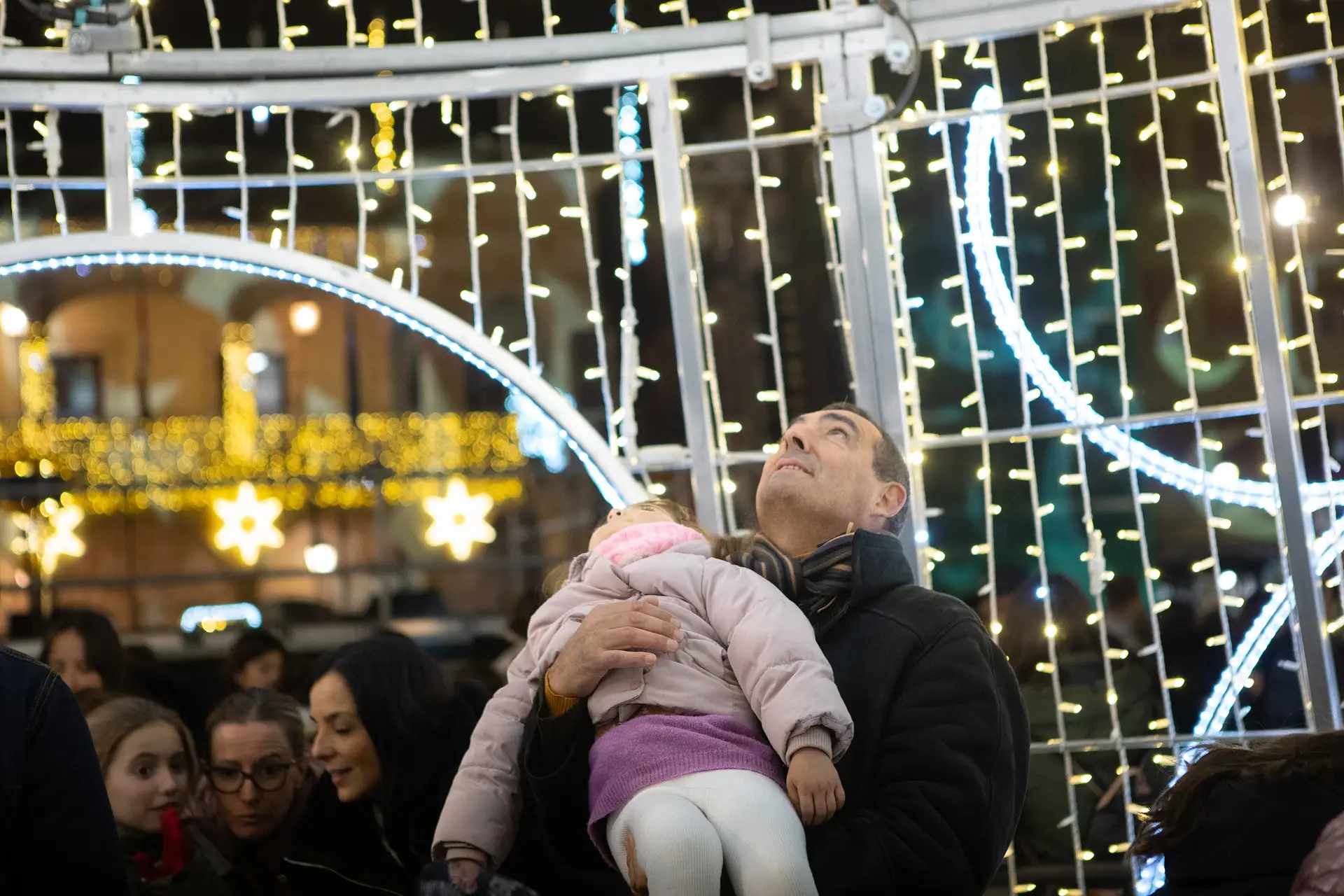 Un hombre mira hacia las luces con una niña en brazos. Foto Paloma V. Escarpa.