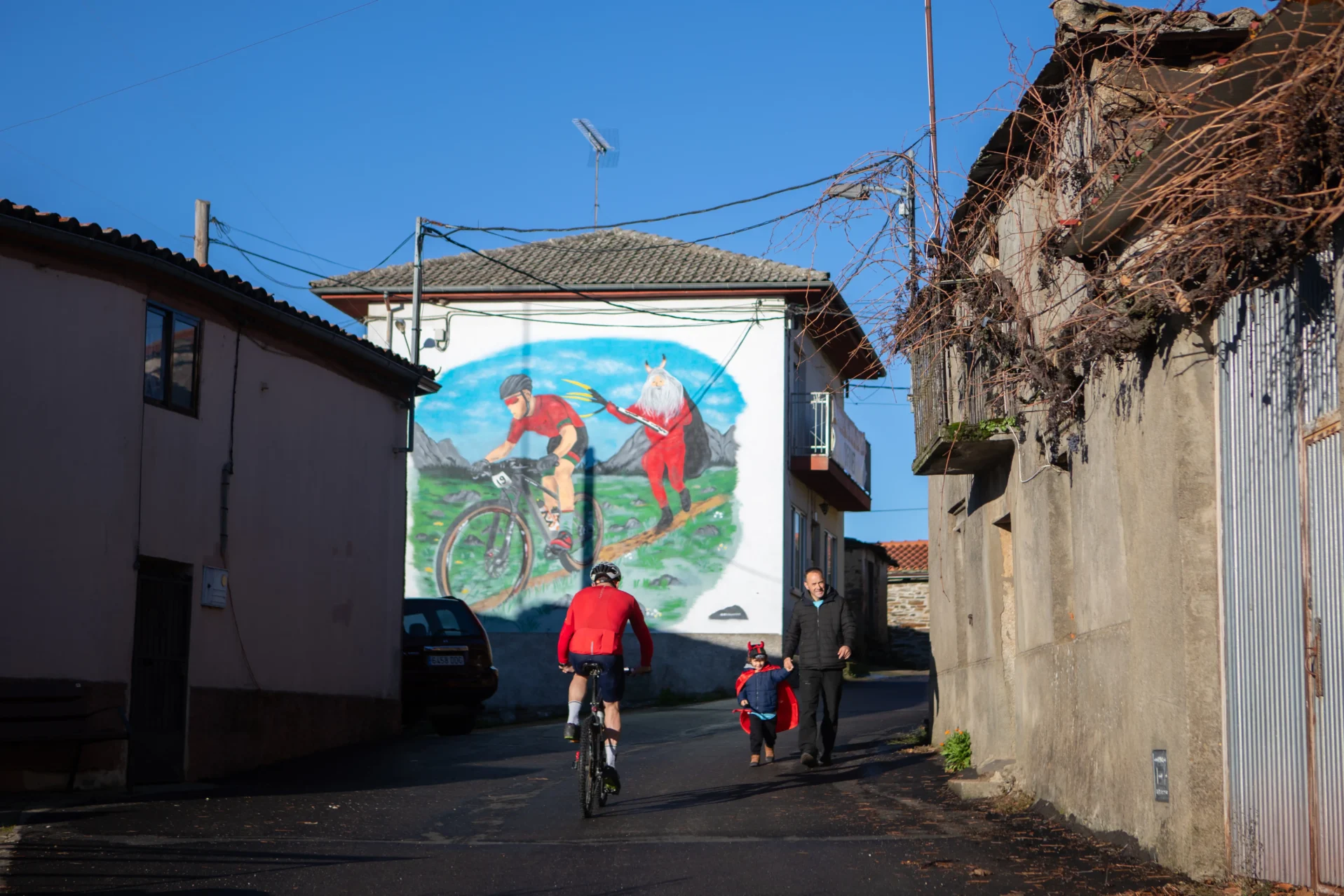 La pintada es una de las últimas escenas que contempla el visitante antes de girar a la derecha y toparse con la zona de la salida. Veinte minutos antes de la salida, el lugar ya es un hervidero de ciclistas preparados y de vecinos atendiéndolos. Pero ahora iremos a eso. Primero, ¿dónde está el diablo? «No ha podido venir este año», aclara la gente de Ufones. «Motivos personales positivos», añaden. Pero basta un vistazo alrededor para comprobar que Gonzalo cuenta con sustitutos: uno, dos, tres… diez. ¿Cuántos?