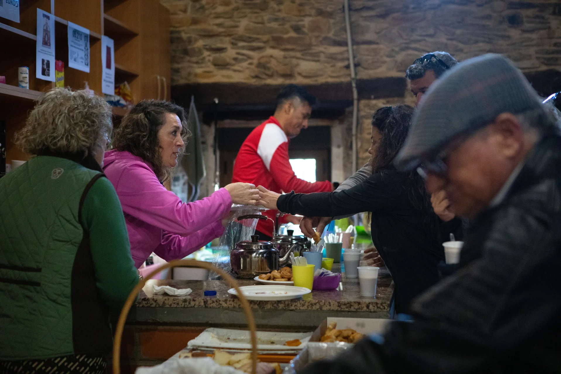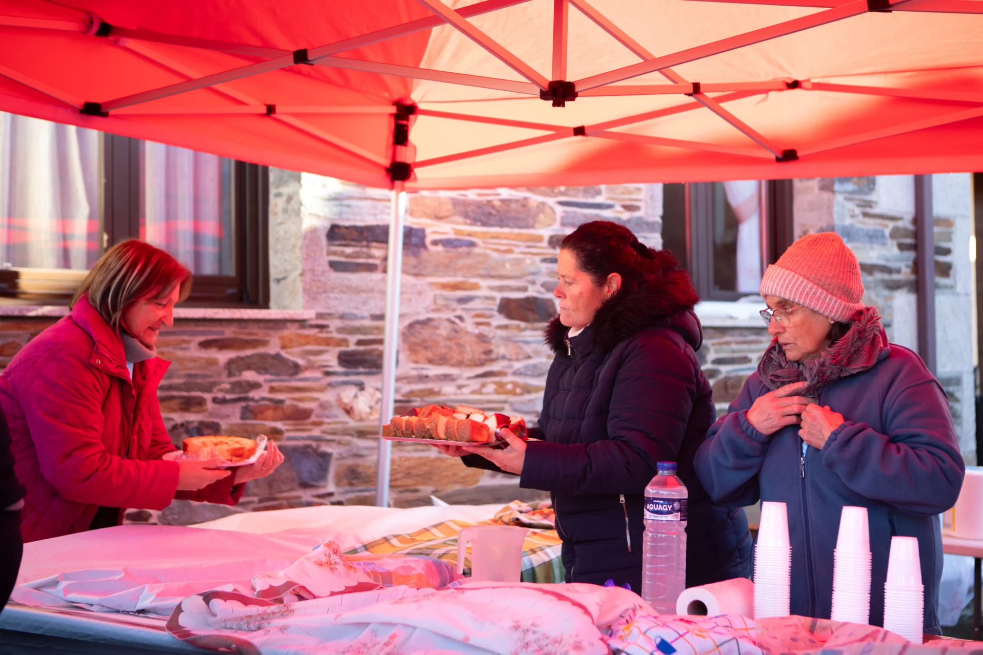 Porque no son solo los diablos. Frente a la zona de salida, empiezan a llegar personas – sobre todo, mujeres – con platos y cazuelas. Traen caldo, tortillas, empanadas, muchos bollos, pastas, café, lo que sea. Los participantes, que ya saben de qué va el asunto por la experiencia de otros años, se alimentan, dan las gracias y se preparan para salir. Todo es gratis, todo lo prepara la gente del pueblo y «todo es artesano», como constata Isa Gago, que despacha desde la mesa colocada para la ocasión.