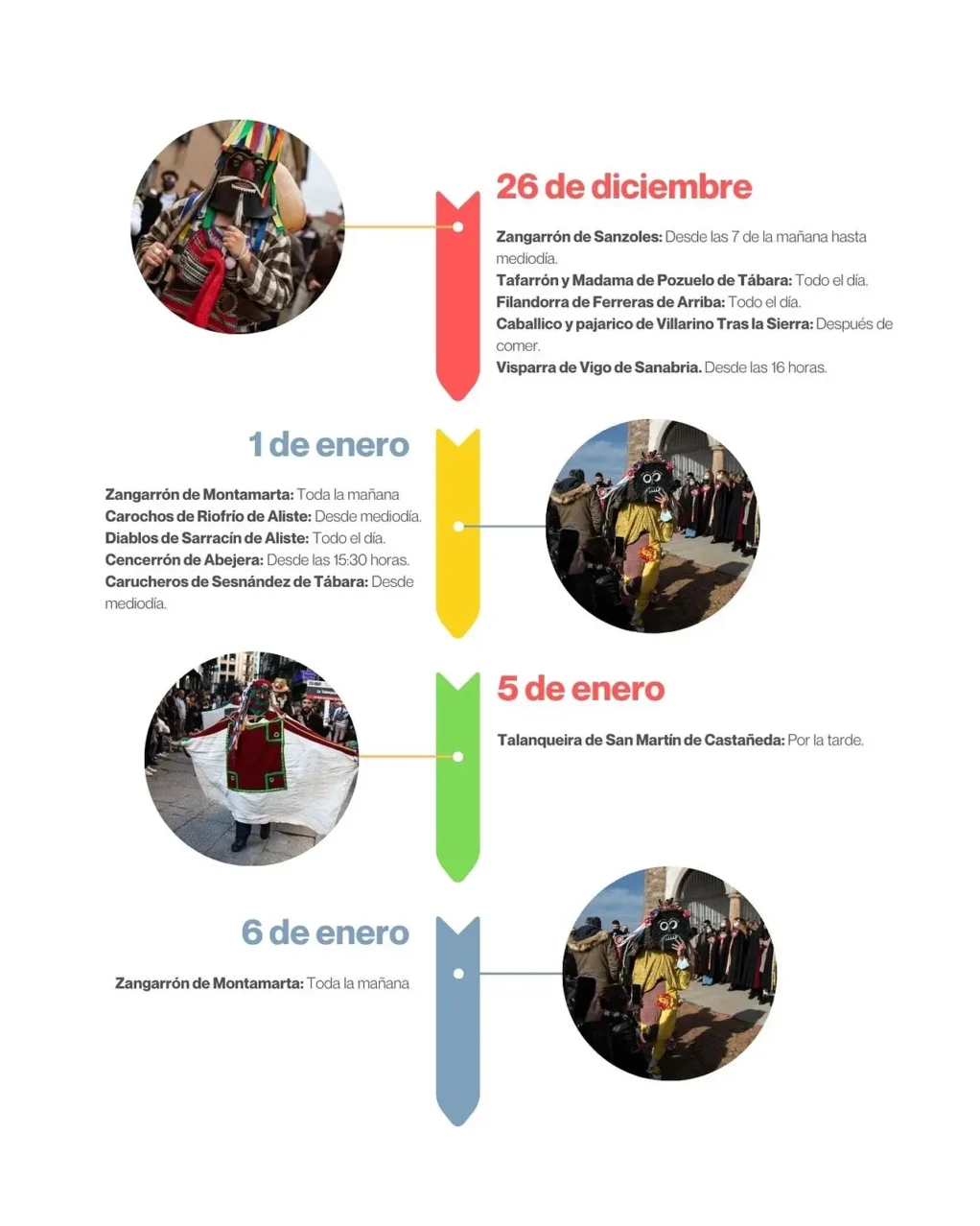 La primera de esas jornadas llega este viernes 26 de diciembre con la salida a las calles de sus respectivos pueblos de las tradiciones de Sanzoles, con su zangarrón; de Vigo de Sanabria, con su Visparra; de Pozuelo de Tábara, con su Tafarrón; de Villarino tras la Sierra, con el Pajarico y el Caballico; o de Ferreras de Arriba, con la Filandorra.