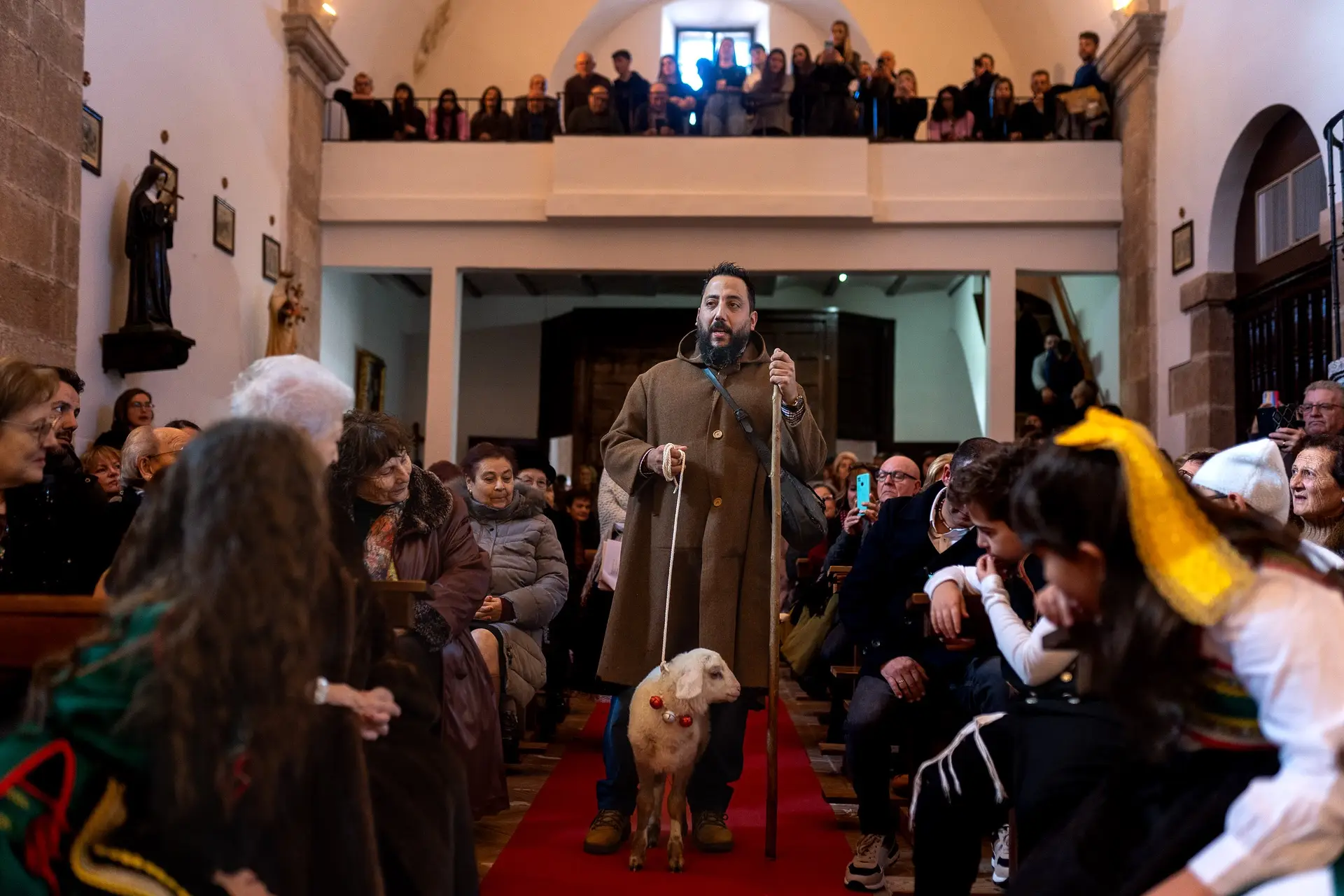 Y, entonces, el teatro: «Abrid las puertas del templo del glorioso San Miguel, que venimos los pastores a ver a la hermosa Raquel». El silencio de la iglesia se quiebra con los golpes, y luego con las voces de quienes avanzan lentamente por el pasillo. Los coros del pueblo, el masculino Puernatus y el femenino Nuestra Señora del Piñedo, cantan y van dando forma al auto que viene. Al fondo, se ubican María, San José y un ángel llamado Izan que cumple con su misión y da paso al momento de la cordera.