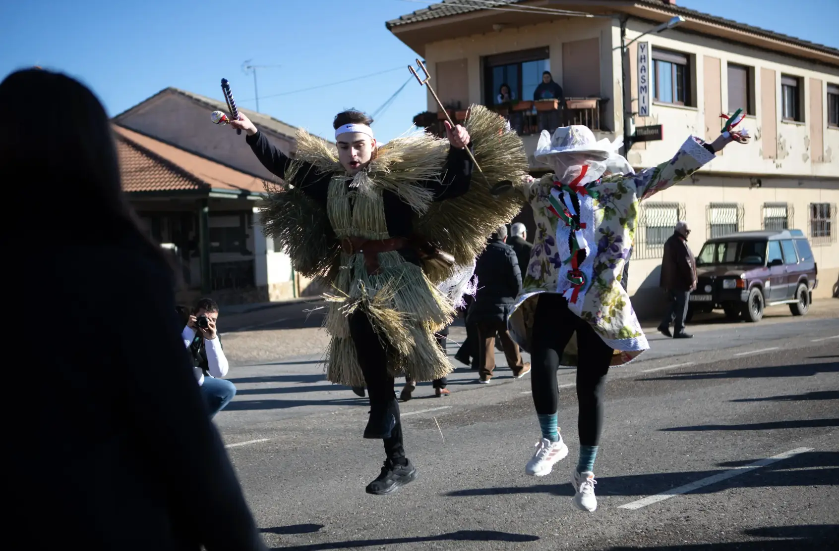 Desde ahí, las gentes del pueblo acompañan a los protagonistas de la mascarada en una vuelta circular en procesión. Ni Iván ni Izaro se detienen en ningún momento. No pueden. Ni para esperar el paso de los coches por la N-631. Otros vecinos se encargan de cortar el tráfico. Ellos trotan y saltan de cara al San Esteban que siguen portando los entrantes, ahora en movimiento. El Tafarrón y la Madama se entienden, se comunican, tienen complicidad: «¡Ahora!», dice él cuando quiere coordinar el paso. «¡Una, dos y tres!», escoge ella cuando toma la iniciativa. Y allá van como uno solo.