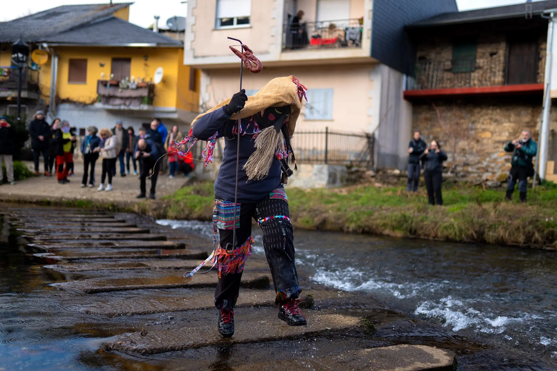Ya de nuevo en la zona cercana al puente que devuelve a los personajes al punto de partida, la confianza va creciendo: un careto coge a un niño en brazos y amenaza con tirarlo al pilón, otra de las mujeres para a un coche por el empedrado para reclamarle en portugués «só um eurinho» para la fiesta y David, el de la gaita, toca la melodía apropiada para que un grupo de españoles animados se lance con unas estrofas. Suben la tradición y la hermandad con el primer año del ritual. Ahora, toca sostenerlo.