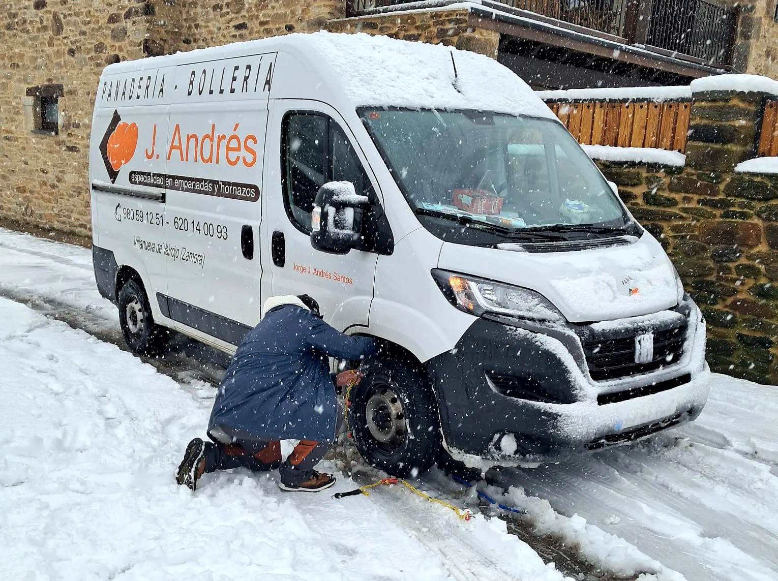 Jorge, de apellido Andrés, es el panadero de Villanueva de Valrojo y va camino de Pedroso y de Linarejos, los dos pueblos que le quedan para completar la ruta de ocho localidades que le toca el viernes. Un rato antes, en Sagallos, ha tenido que parar la furgoneta y poner las cadenas. Siempre las lleva. No es la primera vez que le toca usarlas: «De Codesal para arriba hay bastante», admite el ambulante, que lo tiene claro: «Yendo despacio y con las cadenas, se llega a donde sea».