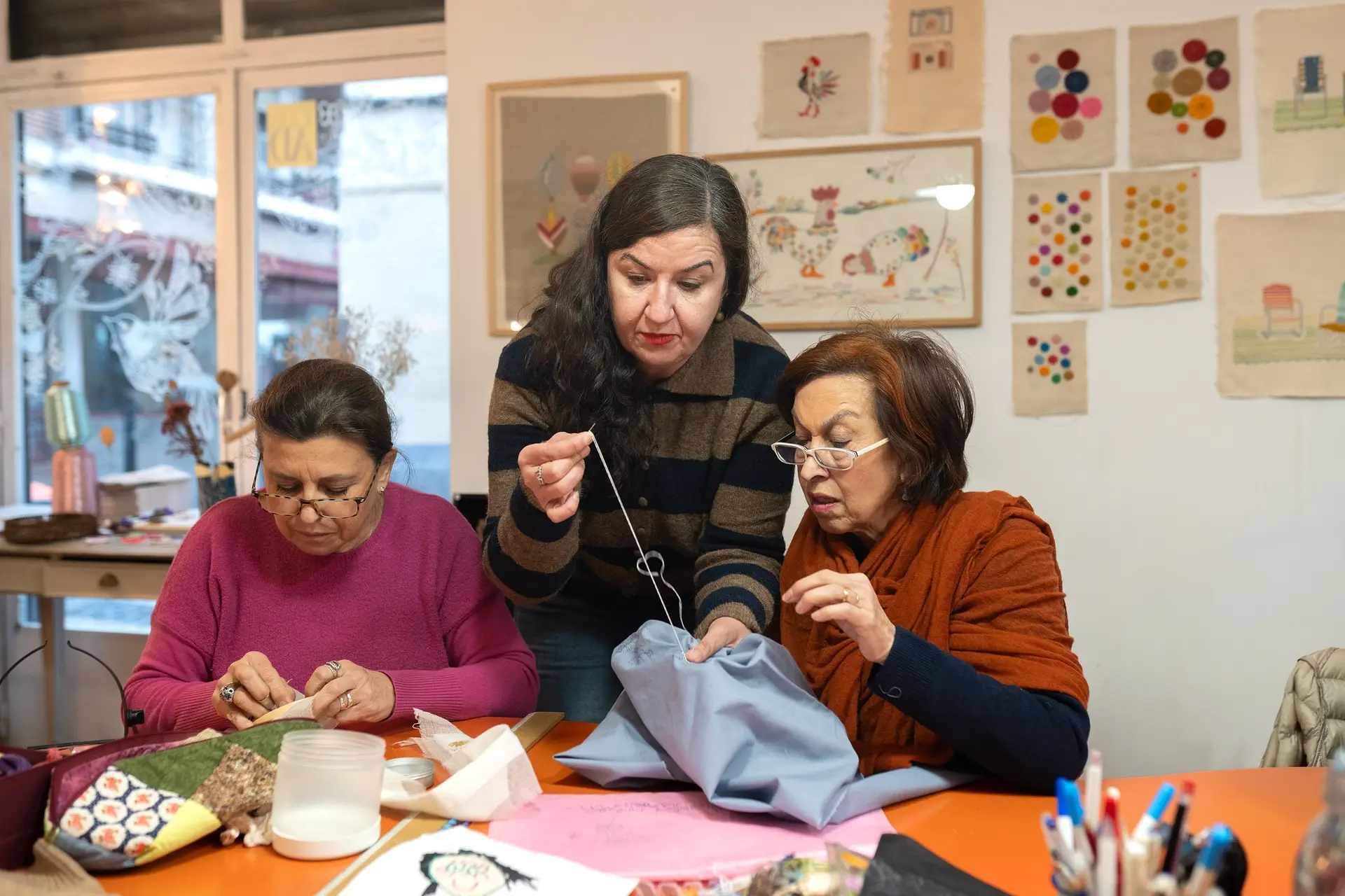 Fuera diluvia, pero dentro de este taller de bordado ubicado en la calle Santa Ana de Madrid, en el centro de la ciudad, funciona eso que las mujeres que están sentadas a la mesa llaman «el calor humano». Por si acaso, una estufa eleva también la temperatura para contribuir al calor hogareño de este lugar donde cada cual se entretiene con lo suyo. En un lateral, una de las alumnas plasma sobre la tela un dibujo que hizo su hija cuando era pequeña; frente a ella, una compañera se esmera para lograr la forma de un árbol y la silueta de unos pájaros; algo más allá, otra trabaja en una pieza para una novia cercana. Todas están enfrascadas en algo.