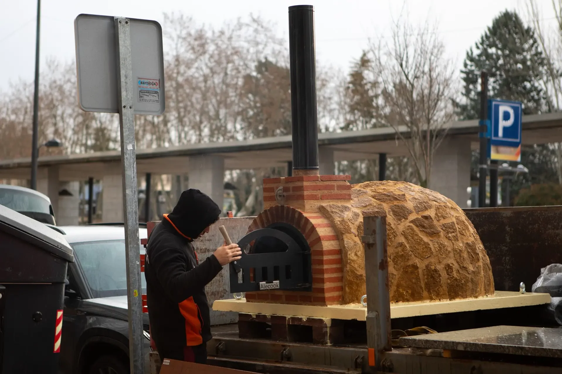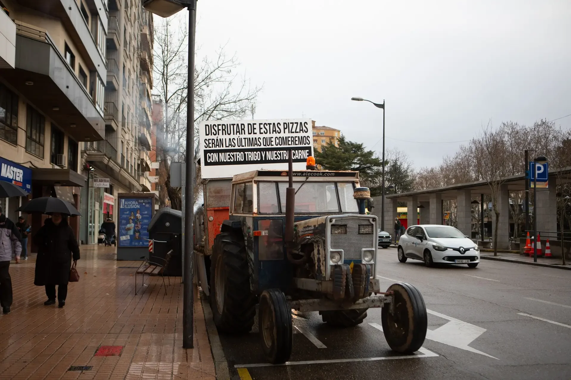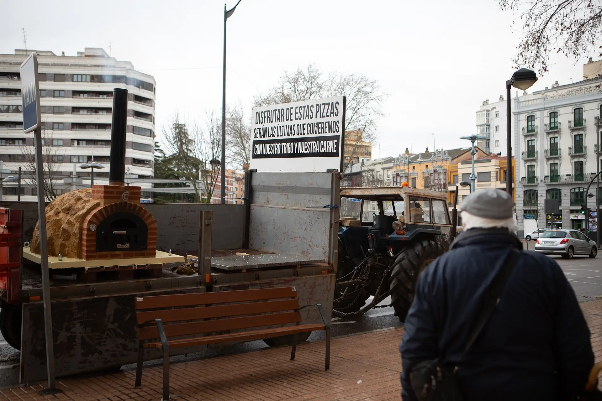 Bien de mañana, con una lluvia fina encima y aún sin cláxones de fondo, los viandantes que pasan por el entorno de La Marina se topan con una escena curiosa. Al pie de las cafeterías que se ubican al final de Príncipe de Asturias, varios tipos han montado un horno sobre un remolque que va enganchado a un tractor. El vehículo es un Ebro con solera y va vinilado. También lleva carteles. Entre ellos, destaca uno: «Disfrutar de estas pizzas. Serán las últimas que comeremos con nuestro trigo y nuestra carne».