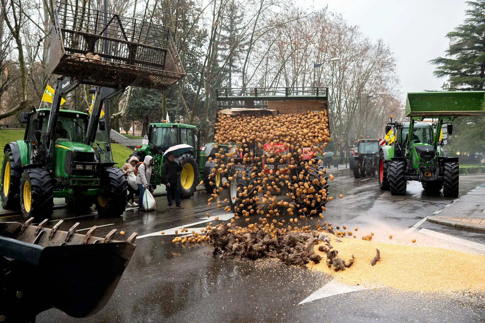 Eso es lo que piensa todo aquel que acudió a la manifestación, cuyos convocantes quisieron visibilizar el panorama arrojando patatas, remolacha, maíz, vides y otros productos sobre una calzada empapada, en la zona pegada a la Delegación Territorial de la Junta en Zamora. Allí mismo hablaron los representantes sindicales y desde ahí partió la comitiva a pie rumbo a la plaza de la Constitución.