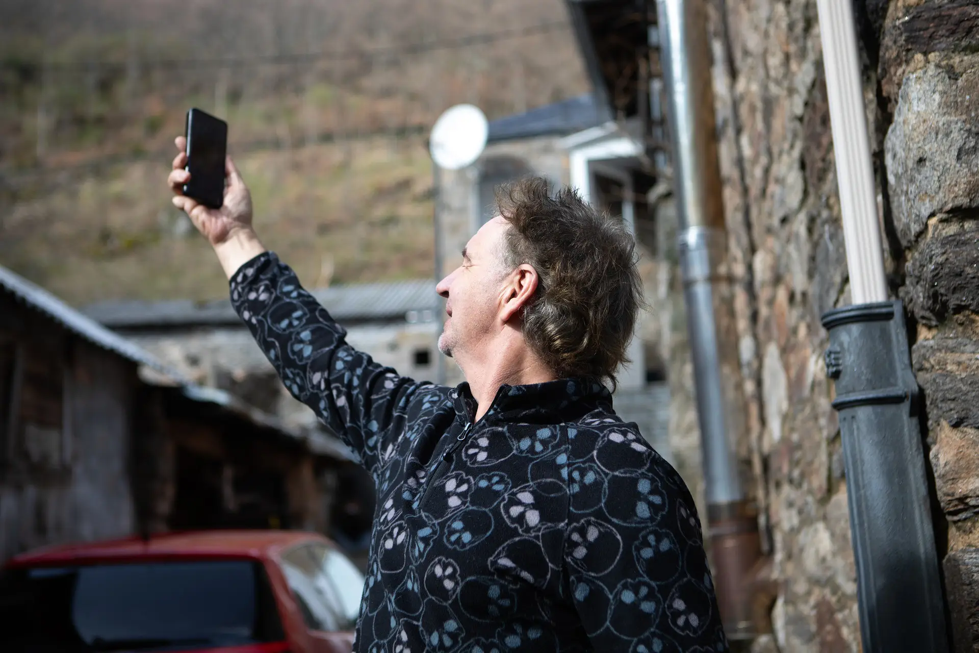 Luciano Fernández eleva el teléfono en busca de algo de cobertura. Foto Paloma V. Escarpa.