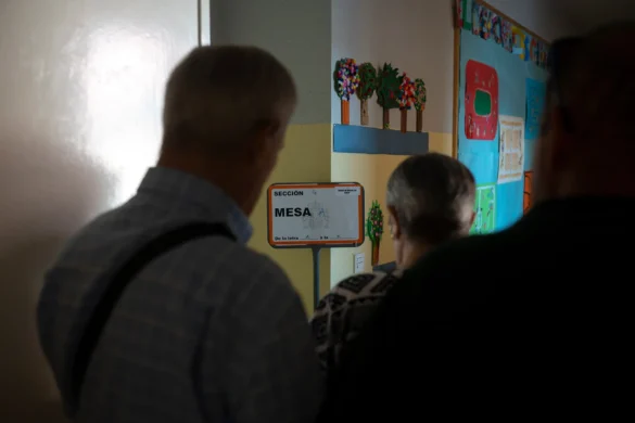 Dos personas consultan la mesa electoral que les correspondía en las elecciones de 2023. Foto Emilio Fraile.