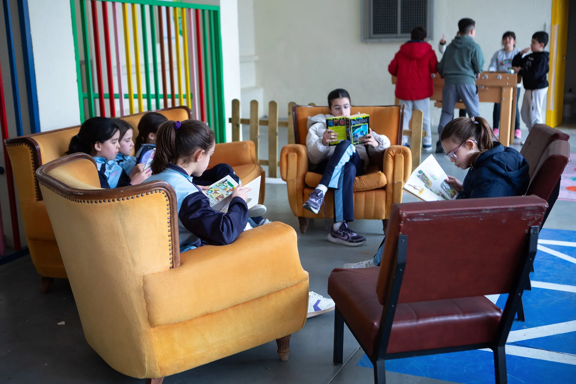 El punto de partida fue el fútbol, pero la realidad es que diversificar el juego y ordenarlo ha hecho que las relaciones entre los críos mejoren. No hay grupos tan cerrados como los ha habido tradicionalmente, los niños y las niñas se mezclan más y los pequeños y los mayores comparten tiempo de ocio. En el caso del Santísima Trinidad, el patio cuenta con un rincón de lectura con un sofá y varios sillones, que tiene una estantería con libros que proponen los propios alumnos. Hay una mesa de pimpón, un futbolín, juegos de mesa y un área más amplia de juegos al aire libre. Incluso los turnos están organizados. “Por ejemplo, primero de Primaria tiene preferencia el lunes por el pimpón, el martes por el futbolín… Y los niños son consicentes y lo respetan, aunque después todos puedan jugar a todo”, apostilla de Mena. “Se ha creado un ambiente que crea espacios seguros para los alumnos, y eso es lo fundamental”, apuntan las mismas fuentes.