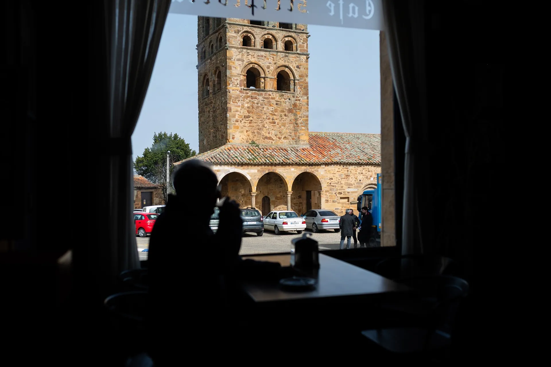 Un hombre toma café. Al fondo, la iglesia y los coches aparcados. Foto Emilio Fraile