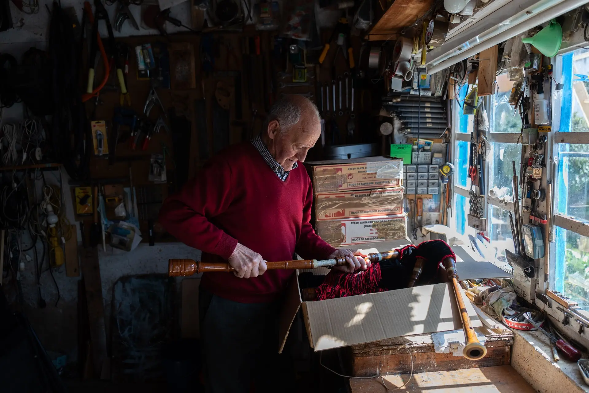 Pero la charla no va del oficio antiguo de este hombre de Cubo, sino de sus labores artesanas; de lo que hacía cuando dejaba las cartas. Primitivo, que ya pasa los 80, se maneja para coger varias cajas de un alto, colocarlas en la mesa y empezar a mostrar. Allí están las gaitas. Hechas por él. De manera completamente autodidacta. Empezó por la necesidad de tener una y acabó haciendo muchas. No acierta a precisar cuántas. Si presume de que algunas han acabado viajando a Argentina, de donde procedían los encargos.