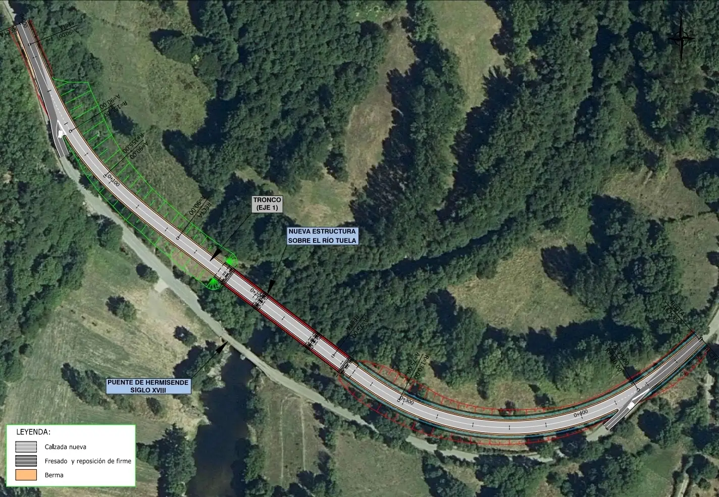 Asimismo, incluye la ejecución de un nuevo puente sobre el río Tuela, con una longitud total de 72 metros, distribuida en tres vanos -dos laterales de 22 metros y uno central de 36 metros. El viaducto contará con dos carriles de 3 metros de anchura, arcenes de 0,5 metros y una acera de 1 metro, alcanzando una anchura total de 10,7 metros. La nueva estructura se construirá aguas arriba del puente actual.