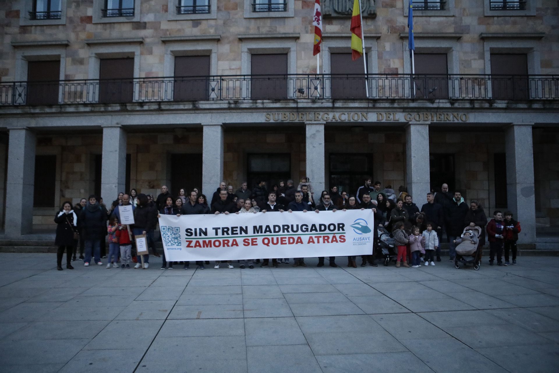 La Asociación de Usuarios de Alta Velocidad de Zamora (Ausave) ha celebrado este viernes una concentración a las puertas de la Subdelegación del Gobierno de Zamora en la que ha reivindicado que Renfe habilite un tren madrugador, que salga de Zamora entre las seis y media y las siete de la mañana, para estar en Madrid antes de las ocho y que los viajeros puedan entrar puntuales a su puesto de trabajo, algo que sucede cada vez menos.