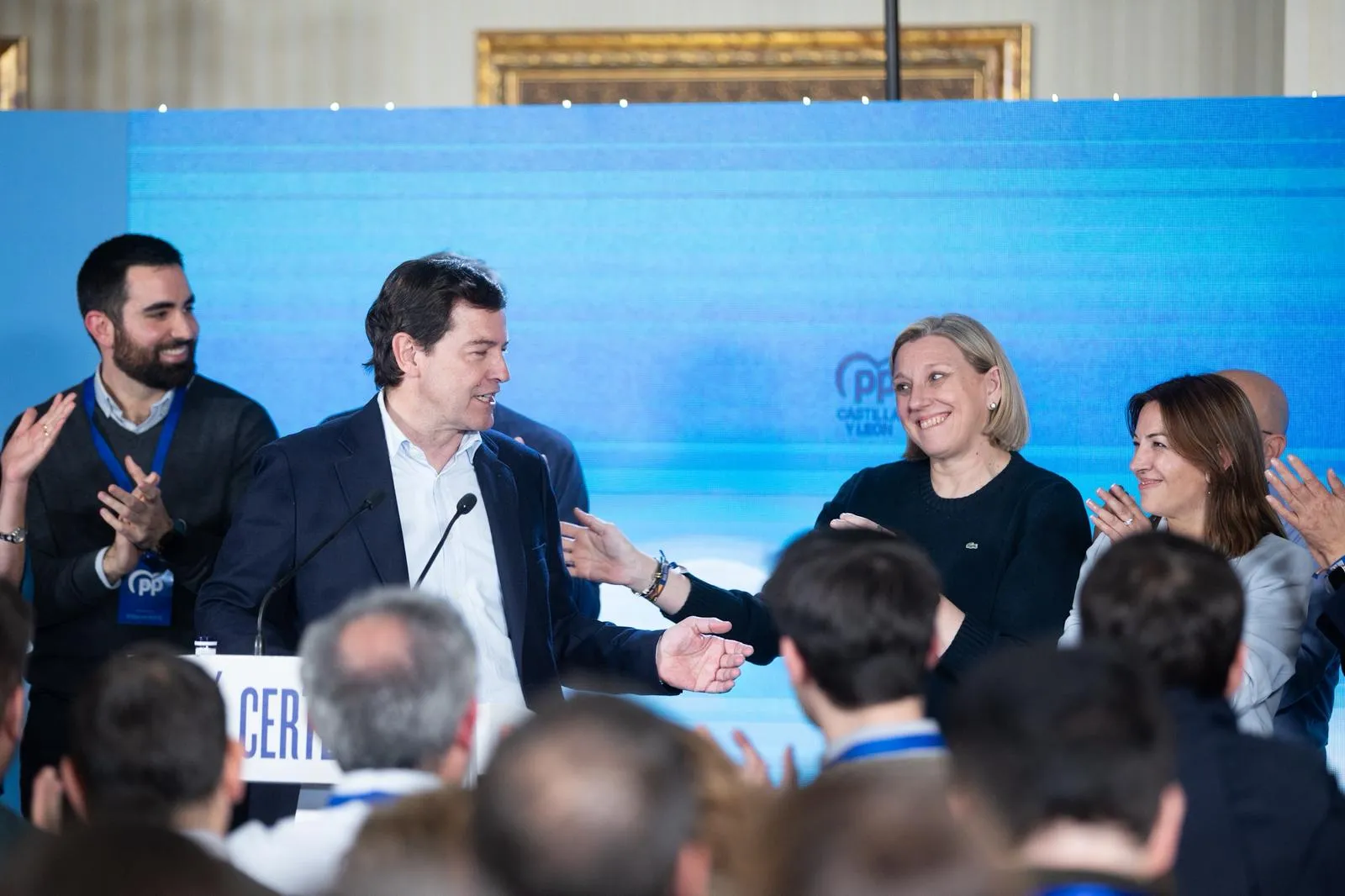 El candidato del PP a la Presidencia de la Junta y ganador de las elecciones de Castilla y León, Alfonso Fernández Mañueco, ha asegurado esta noche que asume «la responsabilidad de formar Gobierno» ante los resultados derivados de las elecciones, que dan ganador al PP con 33 procuradores, a nueve de la mayoría absoluta. «Gobernaremos para todos y pensando en todos porque el bienestar de la gente de esta tierra está por encima de otras consideraciones», ha asegurado un visiblemente contento Mañueco, que ha comparecido rodeado de su equipo en Salamanca. Equipo entre el que se encontraba la directora de campaña, Isabel Blanco, que ha recibido un agradecimiento especial del candidato a presidente.