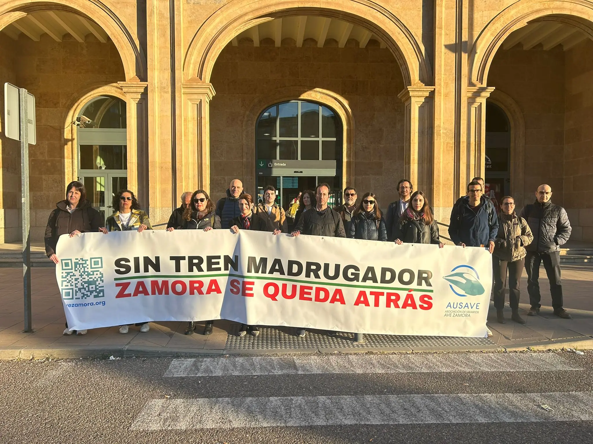 Los usuarios del AVE de Zamora se han plantado este viernes a las puertas de la estación de la ciudad con una pancarta que resume una de sus principales reivindicaciones: la reclamación de un servicio más temprano que permita conectar a la provincia con Madrid y que sea asimilable al que tienen otras capitales ubicadas a una distancia similar de la gran urbe española.
