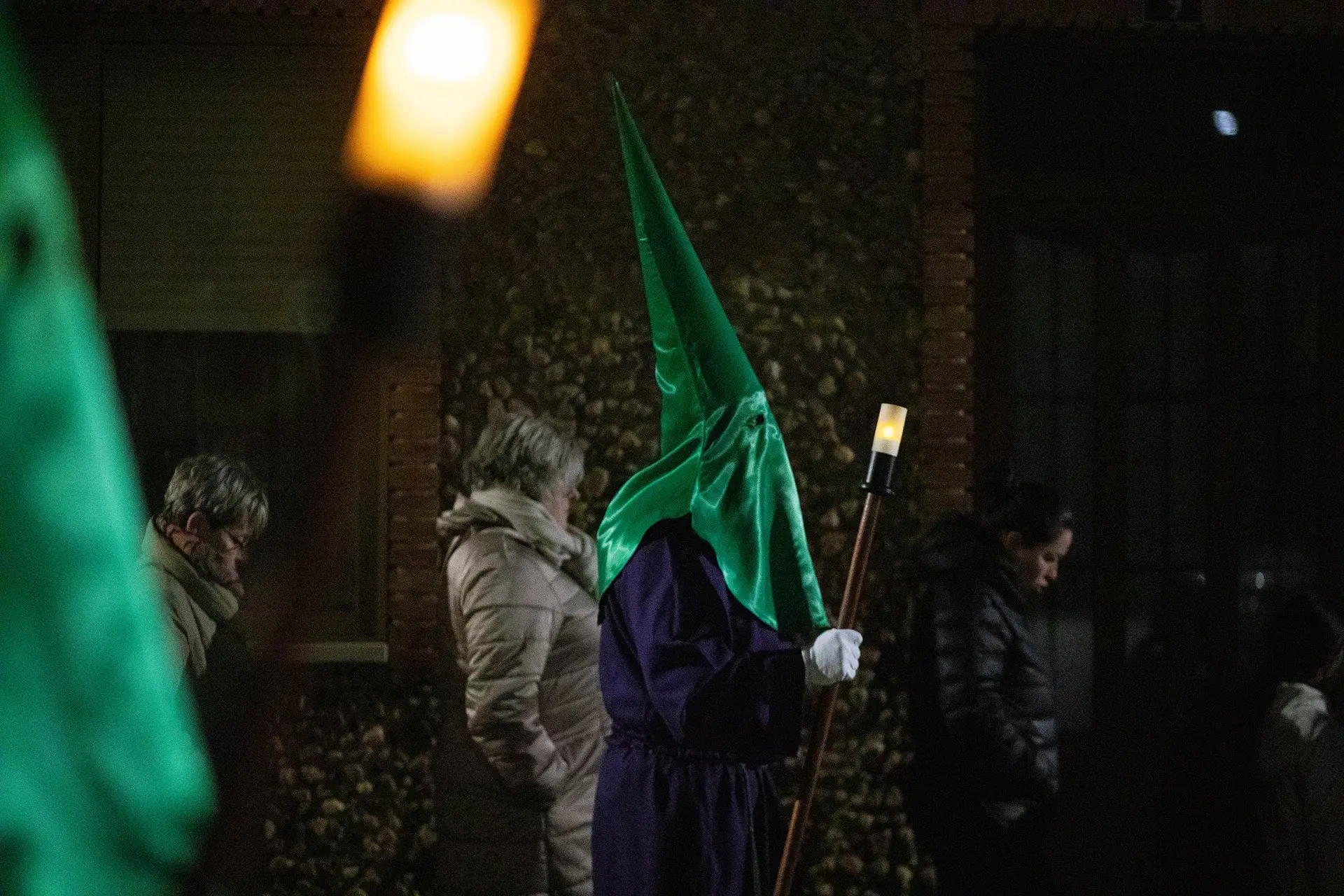 Bruno San Pedro Pérez es un cofrade en Viernes de Dolores. Va vestido de morado, con zapatillas oscuras y, al contrario que los hermanos que le rodean, avanza sin el caperuz verde, con el rostro descubierto. Hay disculpa para ese desliz en el atuendo: Bruno tiene dos años. Normalmente, vive en Medina de Rioseco, pero su familia es del lugar por el que el niño camina en esta noche fría de Semana Santa: de Villalpando. Allí, junto a Álvaro, su padre, el pequeño resiste el recorrido a pie desde San Nicolás hasta la Plaza Mayor. Luego, contempla el resto desde los brazos de su madre. Quizá, no recuerde este día, pero ha sido su primera vez como congregante.