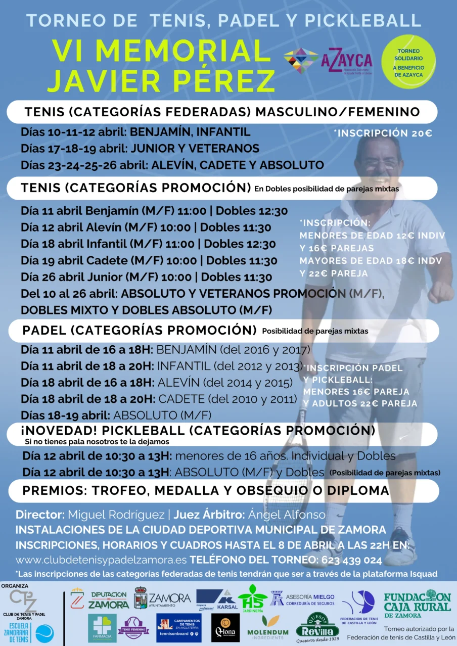 El Club de Tenis y Pádel Zamora ha presentado este martes, en las dependencias de Caja Rural, la sexta edición del Memorial Javier Pérez, un torneo deportivo que se celebra en beneficio de Azayca (Asociación Zamorana de Ayuda frente al Cáncer) y que se disputará del 10 al 26 de abril en las dependencias de la Ciudad Deportiva.