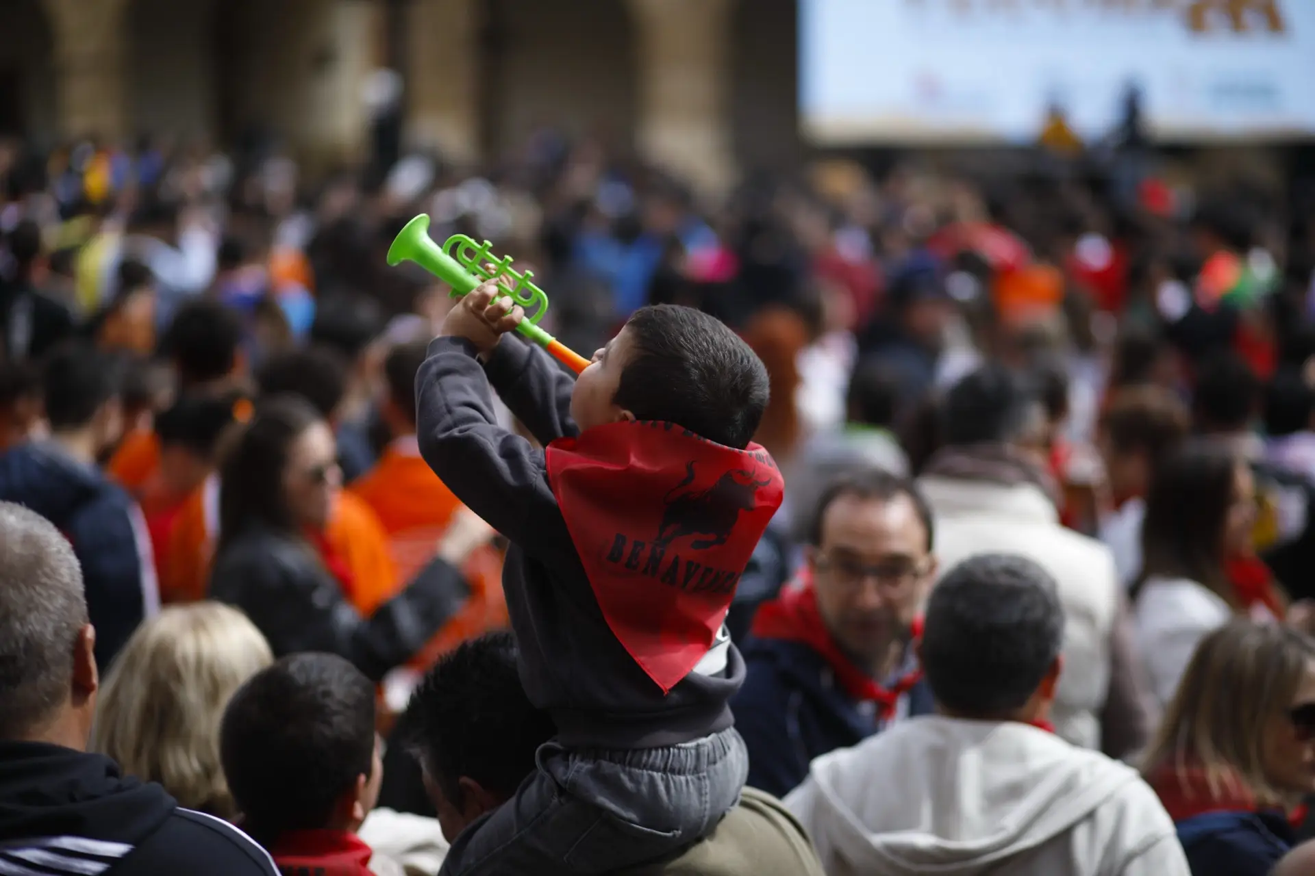 Por eso, algunos padres bajan de los hombros a los niños. Hay que cuidarse para el momento. Otros muchachos danzan de brazo en brazo y aguantan carantoñas. Lo hace Yago. Y lo hace Daniela. Los dos llevan un pañuelo rojo con su nombre, uno igual que el que portan los mayores. Esa prenda y el sentimiento es lo que une a todos los que se han reunido en la plaza con las camisetas de sus peñas. Pronto llegará el estallido.
