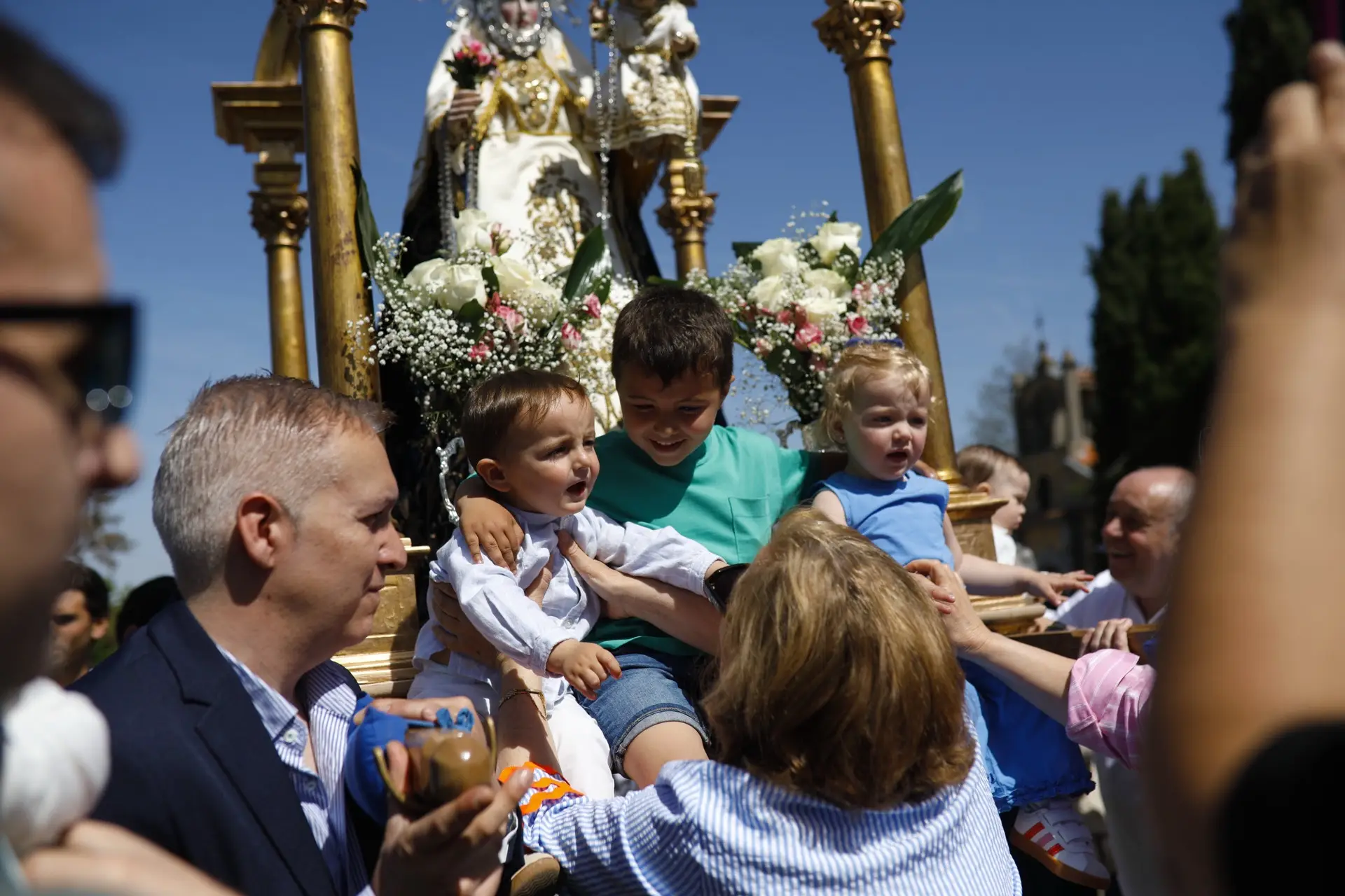 Allá van todos, a colocar al suyo. Muchos de los muchachos ya repiten de otros años. Desde bien bebés, las familias sitúan a los nenes en posición para cumplir con la tradición. O con la devoción. Cada cual con lo suyo. Esto se hace de toda la vida. Más reciente es lo de la nube de teléfonos móviles en busca de inmortalizar el instante. La escena se repite varias veces en la vuelta alrededor de la ermita. Van dos niños. Y cuatro. Y seis. Y ocho. Y más de diez. Por turnos, claro. Y con el paso detenido.
