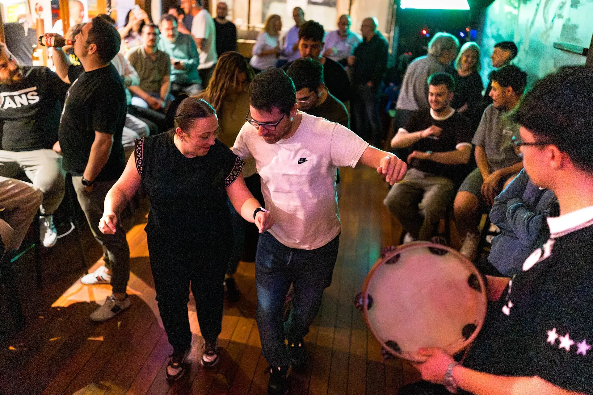 «Ya sabéis como funciona», advierte el propio Martínez, minutos después, desde el escenario. Él mismo rompe el hielo para lidiar con la timidez de la gente. Ya en la segunda pieza, tres parejas se suman al baile: «Vamos hasta el pueblo de Cerezal de Aliste», advierte el músico. Y la fiesta ya no para. Las tres parejas pronto son el doble. La contención se transforma en gritos, en la aparición de más instrumentos y en aplausos. Más gente entra en el bar.