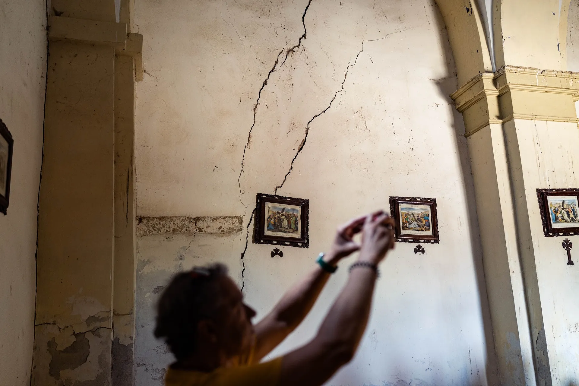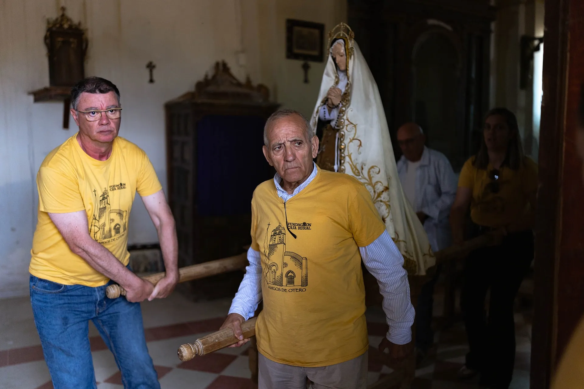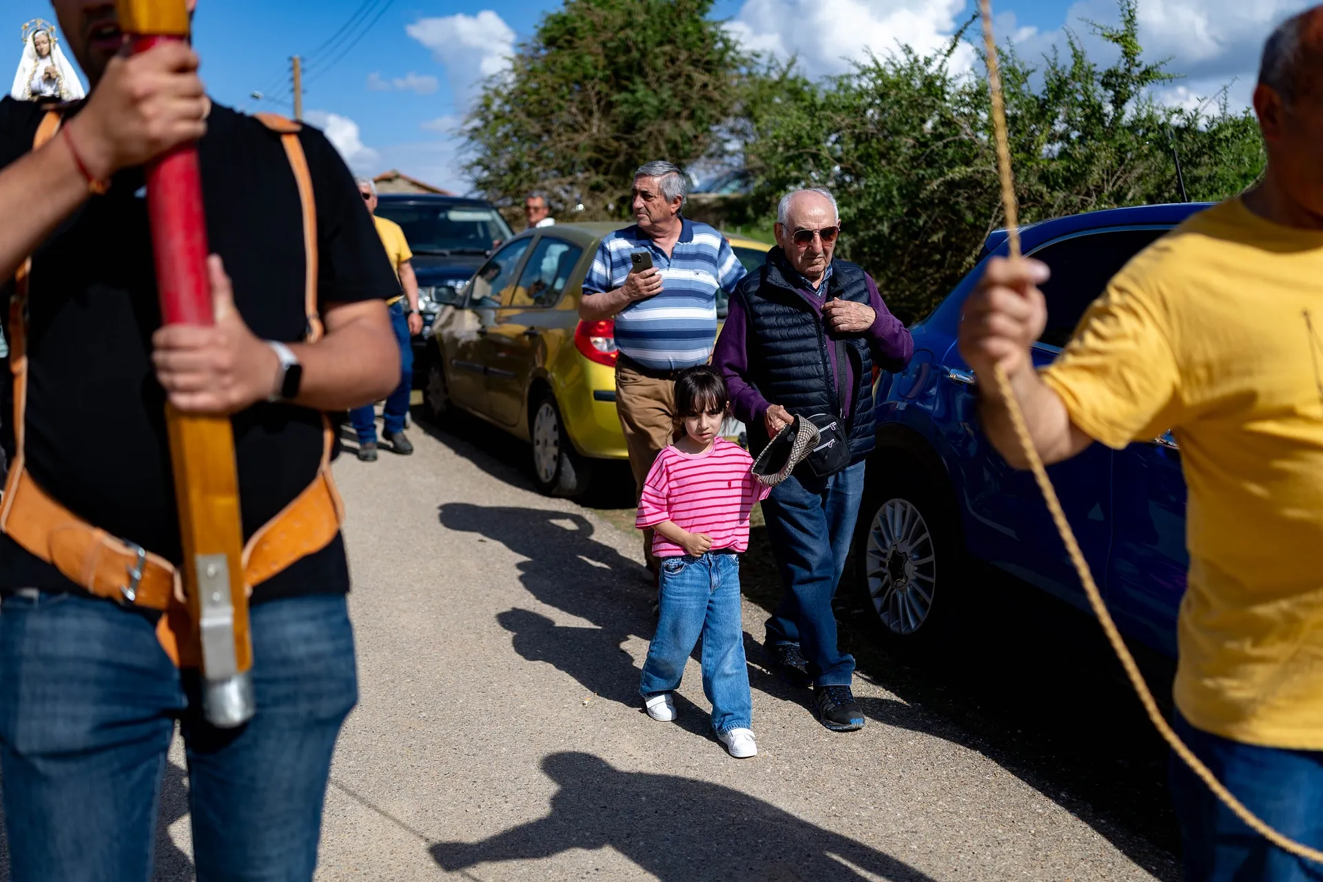 La iglesia que antes mencionaba Montero es lo más delicado del pueblo. Este fin de semana, de nuevo, se ha vuelto a abrir, colgado el cartel en la puerta de que, el que entre, lo hace bajo su responsabilidad. Uno entra y ve que hay que echarle un poco de valor para aguantar dentro, porque el estado es muy delicado. «Como no haga algo el Obispado, de aquí a poco se hunde», asegura un hombre que se ha quedado con las ganas de entrar a misa. En el campanario, un par de vecinos se afanan en tocar las campanas sobre una plataforma sostenida por una viga torcida y un muro que amenaza con caer en cualquier momento. Pesa más la tradición que el miedo, se ve.